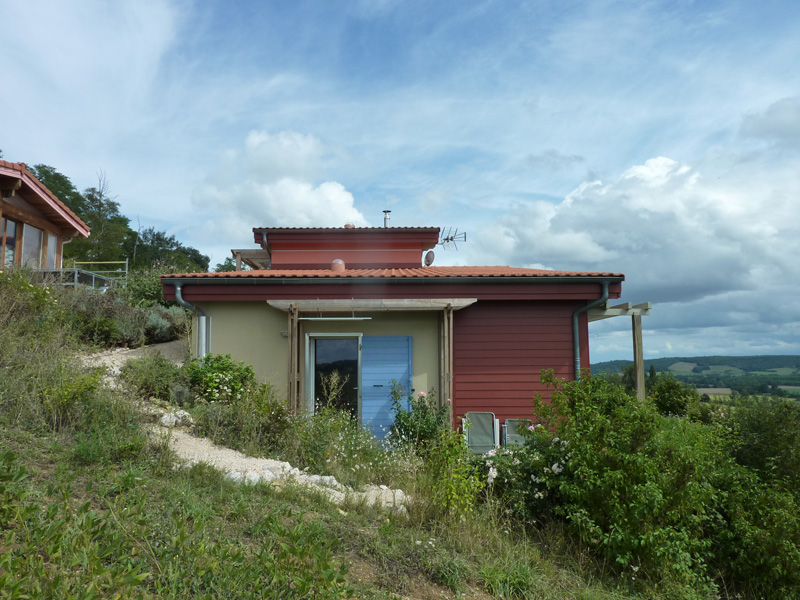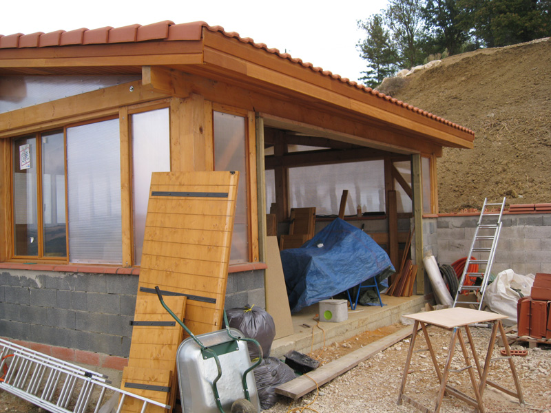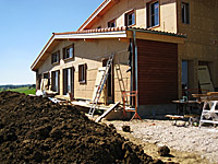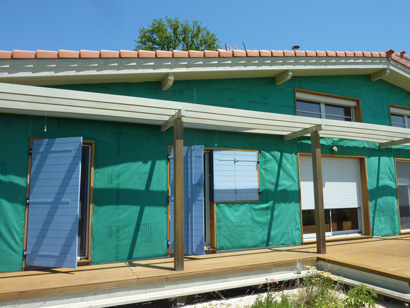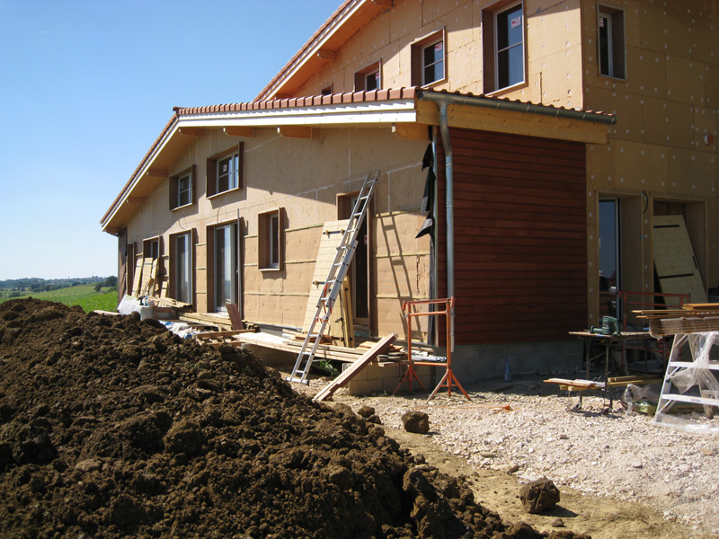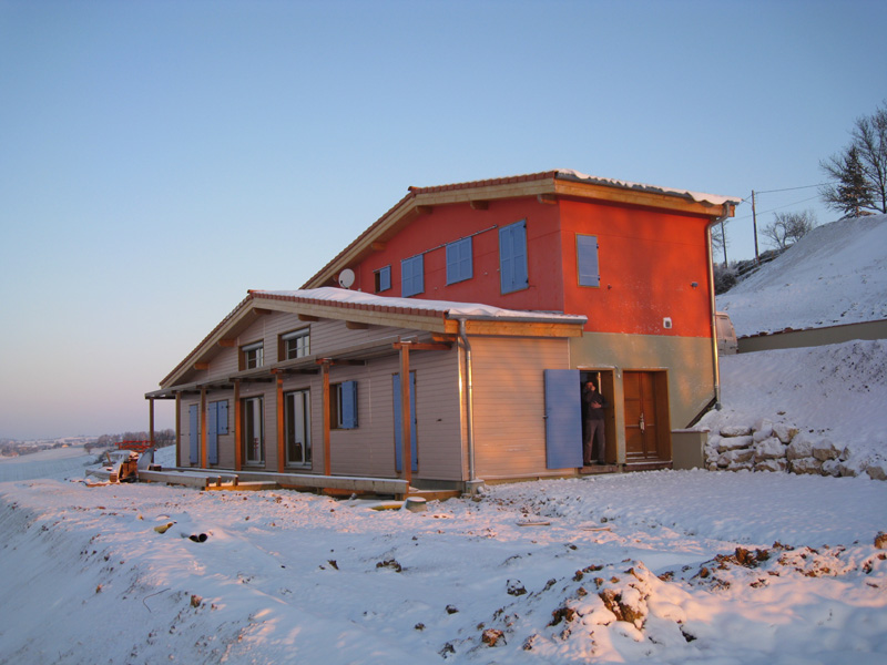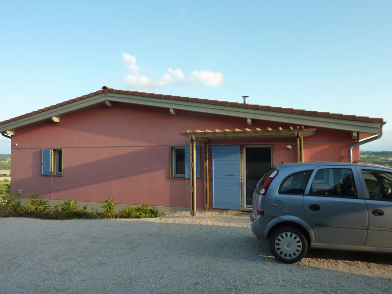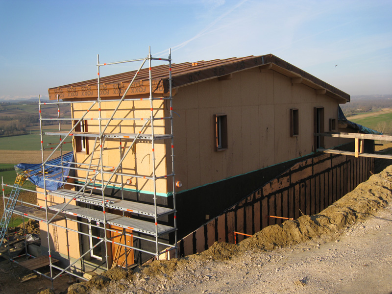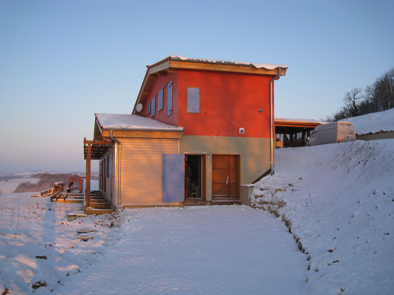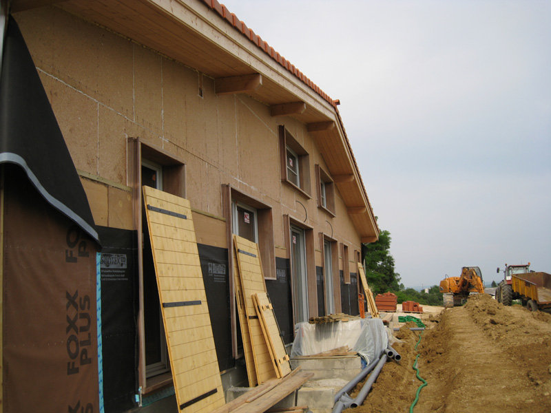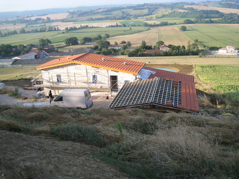 Finalisation d'une maison à très faible consommation d'énergie : - ossature et parements bois HQE - chauffage solaire thermique - electricité photovoltaique - cep 25.8 kWhep/m2/an