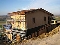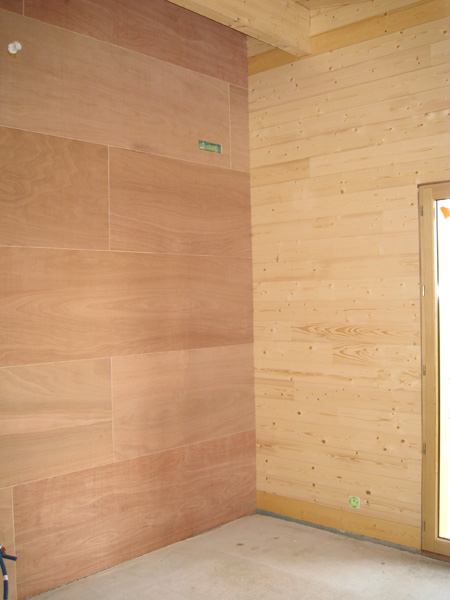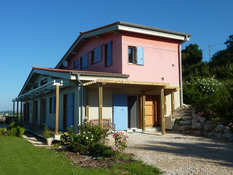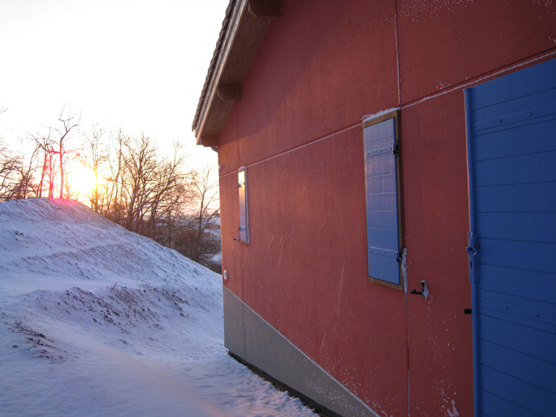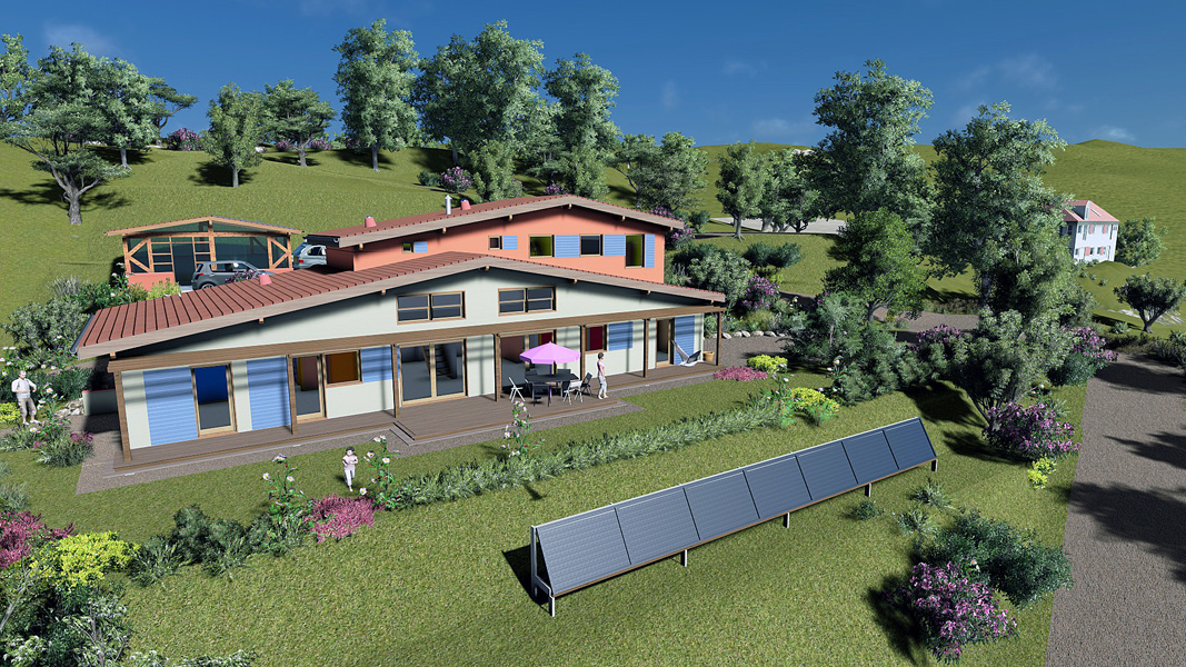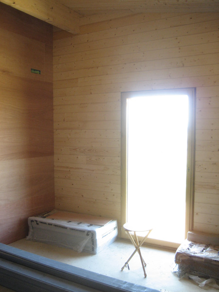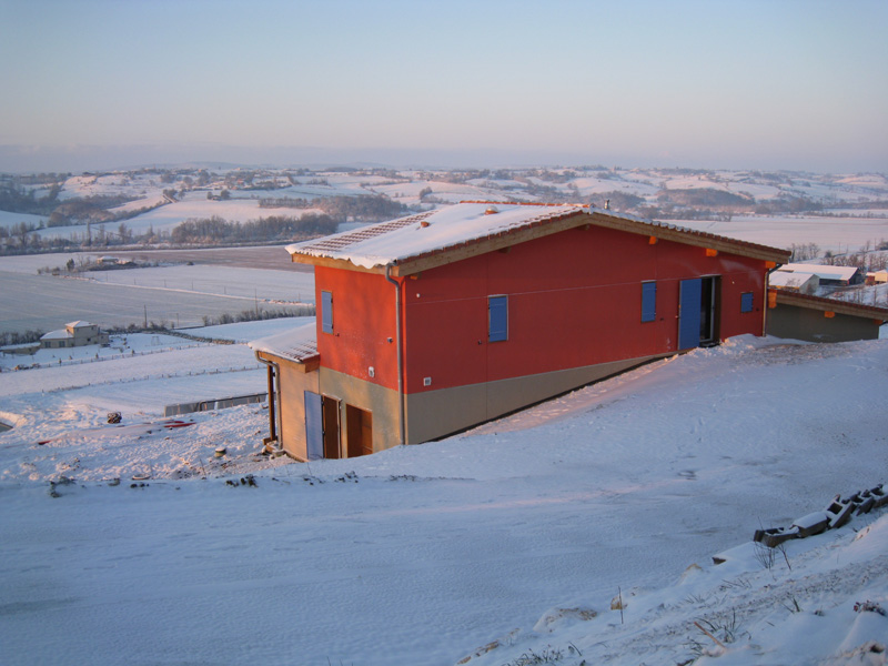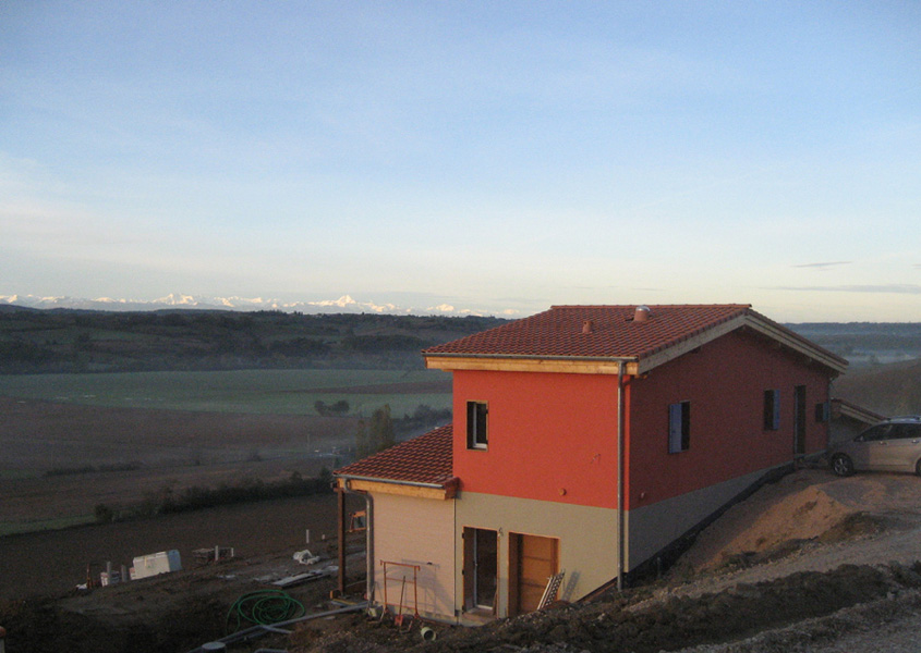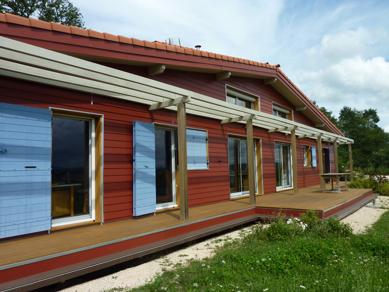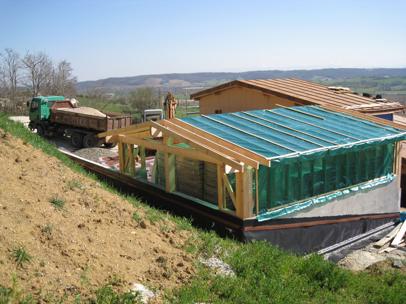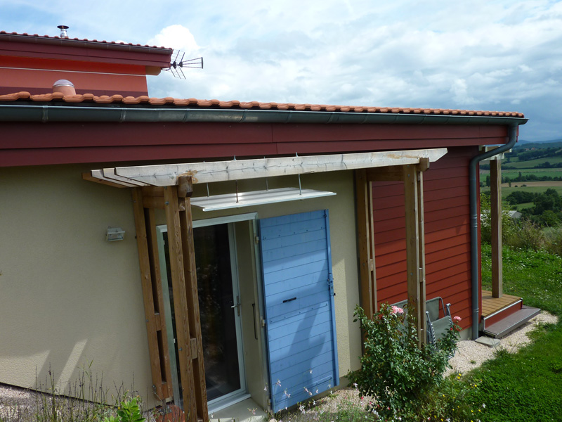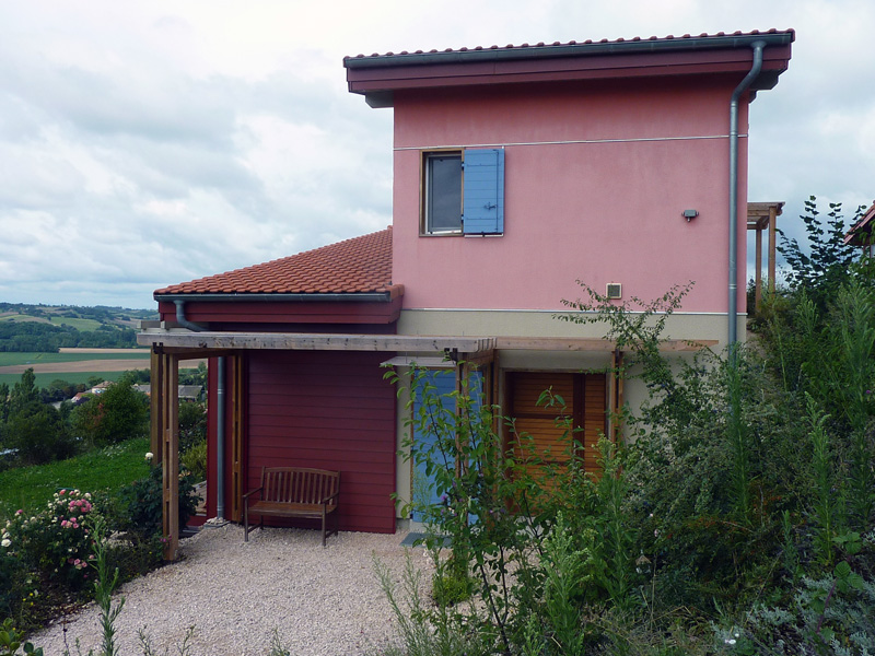 Finalisation d'une maison à très faible consommation d'énergie : - ossature et parements bois HQE - chauffage solaire thermique - electricité photovoltaique - cep 25.8 kWhep/m2/an